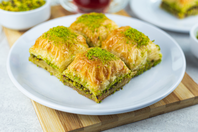 BAKLAVA Categories: SWEET Flaky layers of pastry with sweet syrup and crushed nuts. A rich and indulgent Middle Eastern dessert. $2.99