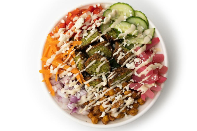A bed of basmati rice topped with falafel fritters, chipotle mango chickpeas, spinach, red onions, cucumber, red pepper, pickled turnip, black beans, julienne carrots, feta cheese, tahini sauce and tzatziki sauce.