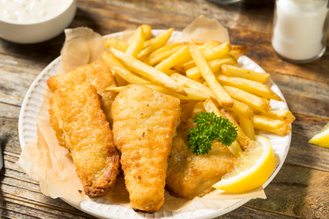 FISH & CHIPS Categories: SEAFOOD Crispy battered fish served with golden fries. A classic and satisfying seafood favorite. $14.99